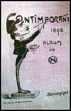 Nicolae S. Petrescu a publié en 1898 un album de caricatures intitulé Contimporani. Cet album est l’un des premiers ouvrages de caricatures publiés en Roumanie[30]. L’album contient 26 reproductions en couleurs d'après des dessins, des caricatures et des aquarelles réalisés par Nicolae Petrescu entre 1897 et 1898[31]. Comme l’annonce l’auteur au début de l’album, sont représentés « les contemporains les plus sympathiques : politiciens, soldats, artistes, savants et journalistes qui ont accepté de poser en face de l’article dont le crayon, quand il griffonne, ne produit que des histoires, aussi fugaces que plaisantes, donc si cela vous plaît, feuilletez, et vous ne verrez aucun médécin. Signé-Galus[32],[33] ». Petrescu choisit les sujets, l’accompagnement de textes explicatifs lui fut en revanche imposé par d’autres[31].