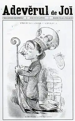 En 1898-1899, Nicolae Petrescu-Găină a exécuté une série de caricatures à caractère politique pour le journal Adevărul de Joi, comme « Faits et discours »[42] ou « La prière du traître »[43].