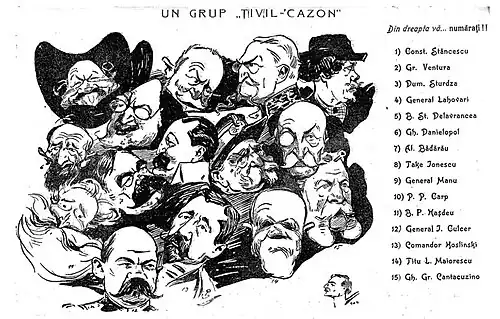 Des généraux roumains sont aussi caricaturés comme le général Năsturel (Constantin Năsturel-Herescu), Anton Berindei, accompagné d’un texte (« Je suis contre les patriotes de l'armée »), faisant allusion au fait qu'il était contre la loi de l’incorporation des Juifs dans l'armée roumaine ; Jacob Lahovary en costume de gala militaire dans une bataille de bals et de salons ; Constantin Budişteanu, ministre de la guerre de l'époque, avec un fusil à la main, une allusion à sa déclaration devant le Parlement roumain que le fusil Mauser était un canular et demandant l'achat d'un nouveau[34].