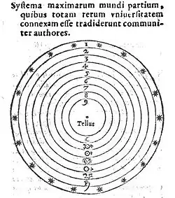 Malgré la modernité révolutionnaire de son système, Copernic conserve certains éléments archaïques des anciens systèmes du monde : ainsi l'idée aristotélicienne (pourtant abandonnée par Ptolémée et même probablement déjà par Hipparque) des sphères solides[Note 10], ou encore la sphère des fixes, contenant les étoiles et marquant la limite d'un univers fini[35].