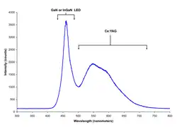 La longueur d’onde émise, qui dépend de la bande interdite du matériau, peut être contrôlée par le rapport GaN/InN : proche ultraviolet pour 0,02 In/0,98 Ga, 390 nm pour 0,1 In/0,9 Ga, violet-bleu à 420 nm pour 0,2 In/0,8 Ga, bleu à 440 nm pour 0,3 In/0,7 Ga, rouge pour des rapports plus élevés, aussi que par l'épaisseur des couches d'InGaN qui sont généralement de l’ordre de 2 à 3 nm. Cependant, les résultats des simulations atomiques ont montré que les énergies d’émission dépendent peu des petites variations des dimensions des dispositifs[10]. Des études basées sur la simulation de dispositifs ont montré qu’il pourrait être possible d’augmenter l’efficacité des LED InGaN/GaN en utilisant l'ingénierie de la bande interdite, en particulier pour les LED vertes[11].
