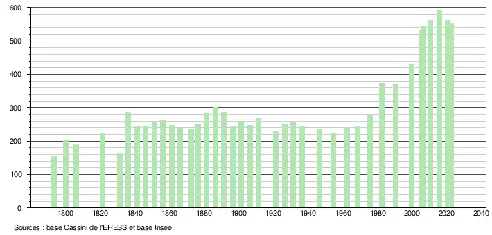 L'évolution du nombre d'habitants est connue à travers les recensements de la population effectués dans la commune depuis 1793. Pour les communes de moins de 10 000 habitants, une enquête de recensement portant sur toute la population est réalisée tous les cinq ans, les populations de référence des années intermédiaires étant quant à elles estimées par interpolation ou extrapolation[19]. Pour la commune, le premier recensement exhaustif entrant dans le cadre du nouveau dispositif a été réalisé en 2005[20].