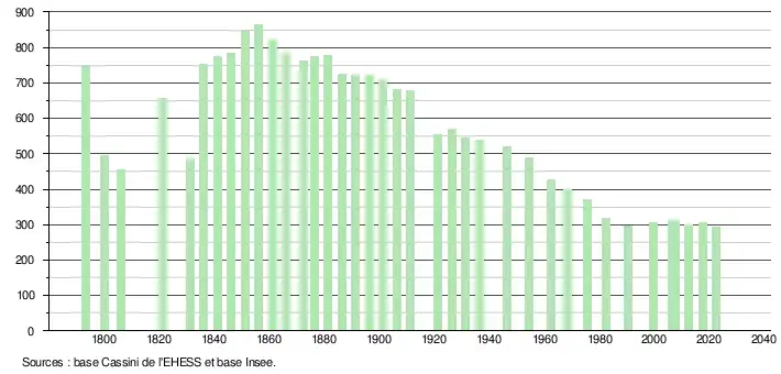 L'évolution du nombre d'habitants est connue à travers les recensements de la population effectués dans la commune depuis 1793. Pour les communes de moins de 10 000 habitants, une enquête de recensement portant sur toute la population est réalisée tous les cinq ans, les populations de référence des années intermédiaires étant quant à elles estimées par interpolation ou extrapolation[23]. Pour la commune, le premier recensement exhaustif entrant dans le cadre du nouveau dispositif a été réalisé en 2007[24].