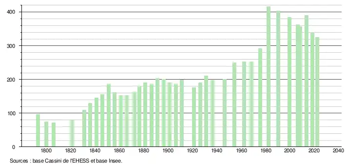 L'évolution du nombre d'habitants est connue à travers les recensements de la population effectués dans la commune depuis 1793. Pour les communes de moins de 10 000 habitants, une enquête de recensement portant sur toute la population est réalisée tous les cinq ans, les populations de référence des années intermédiaires étant quant à elles estimées par interpolation ou extrapolation[16]. Pour la commune, le premier recensement exhaustif entrant dans le cadre du nouveau dispositif a été réalisé en 2008[17].