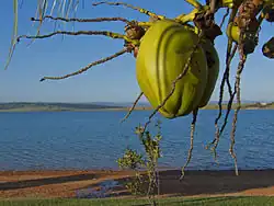 Le fruit mesure entre 10 et 40 cm de long et entre 10 et 16 cm de large[3], et pèse jusqu'à 1,5 kg. Il est lisse et de couleur vert clair ou orange lorsqu'il n'est pas mûr puis tirant sur le brun. Il est constitué d'une épaisse couche de fibres ligneuses brunes, non comestibles[a], qui entourent la graine.