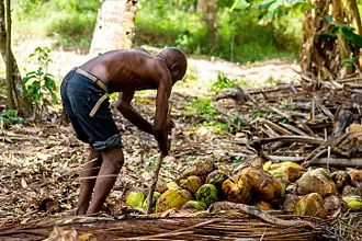 Pour la récolte du coprah, la noix de coco est ouverte d'un coup de hache, et laissée une journée au soleil. L'amande se détache alors plus facilement à l'aide d'un simple couteau ou d'un couteau spécialement destiné à cet usage à lame courbe. L'amande est ensuite mise à sécher sur des séchoirs jusqu'à la disparition quasi totale de sa teneur en eau qui ne doit pas dépasser 6 %.