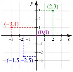 Un nombre réel est un nombre que l'on peut représenter comme un point sur un axe à une dimension. On trouve le zéro, les nombres entiers naturels comme le zéro, 1, 2, 3..., les nombres relatifs négatifs comme –1, –2, –3,..., les nombres rationnels comme 2/3, 4/9, –8/11, etc., et d'autres nombres réels comme √2 (racine de 2). Vu que l'espace est en une dimension (c'est une ligne), un tel nombre réel se représente par une seule coordonnée : le nombre lui-même.