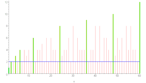 Diagramme en bâtons du nombre de diviseurs , avec en vert les ploutons 1,2,4,6,12,24,36,48,60.