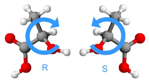 L'isomère R (du latin rectus) est vers la droite, soit une configuration où les substituants prioritaires « tournent » dans le sens horaire. L'isomère S (du latin sinister) correspond à la rotation anti-horaire.