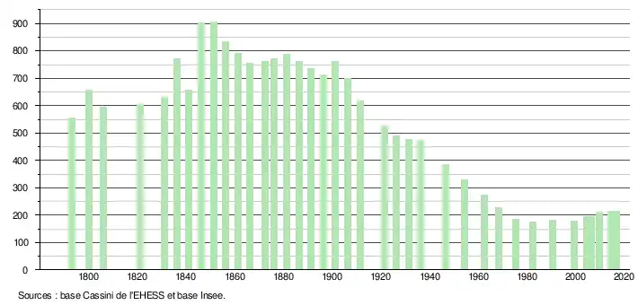 L'évolution du nombre d'habitants est connue à travers les recensements de la population effectués dans la commune depuis 1793. Pour les communes de moins de 10 000 habitants, une enquête de recensement portant sur toute la population est réalisée tous les cinq ans, les populations de référence des années intermédiaires étant quant à elles estimées par interpolation ou extrapolation[5]. Pour la commune, le premier recensement exhaustif entrant dans le cadre du nouveau dispositif a été réalisé en 2004[6].
