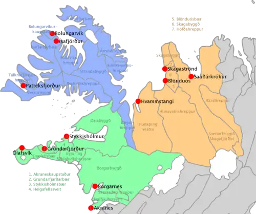 Akranes, Hvalfjarðarsveit, Skorradalshreppur, Borgarbyggð, Eyja- og Miklaholtshreppur, Snæfellsbær, Grundarfjörður, Helgafellssveit, Stykkishólmur, Dalabyggð, Reykhólahreppur, Vesturbyggð, Tálknafjarðarhreppur, Bolungarvík, Ísafjarðarbær, Súðavíkurhreppur, Árneshreppur, Kaldrananeshreppur, Strandabyggð, Bæjarhreppur, Húnaþing vestra, Húnavatnshreppur, Blönduós, Skagaströnd, Skagabyggð, Skagafjörður et Akrahreppur.