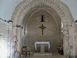 Dans ce sanctuaire à chevet plat, reconstruit en 1665, avec un ermitage qui s'appuie sur son chevet, puis au début du XIXe siècle[3], il ne subsiste de la chapelle romane primitive que les sculptures du chœur, quatre consoles en forme de têtes d’atlante que les archéologues ont daté du XIIIe siècle[2]. « Ces quatre têtes sont d'une diversité technique et d'une richesse symbolique tout à fait remarquables[3], » d'autant qu'il est à souligner que leurs thèmes se rattachent à la mythologie scandinave, « cas unique et inexplicable en pays méditerranéen[1]. ».