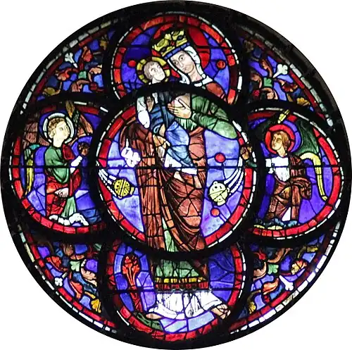 Au centre du vitrail, Marie règne sur son trône céleste. Elle fait partie des cinq « Notre-Dame » devant lesquelles s'arrêtaient au Moyen Âge les pèlerins de Chartres, avec Notre-Dame sous terre, Notre-Dame du bon secours, la Vierge Noire du pilier, et Notre-Dame blanche[1], et était populairement connue à cette époque sous le nom de « Vierge bleue »[2].