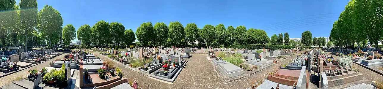 L'augmentation de la population de la commune entraîna la nécessité d'agrandir l'ancien cimetière ou d'en créer un nouveau. Le second choix fut fait et, en , la Ville acquit auprès de la Société Française des Sablières, un terrain de plus de 61 000 mètres carrés aux lieux-dits Les Cornets et Les Grands Réniers[2]. L'avant-projet de la première tranche des travaux fut approuvé le , et sa construction commença le .