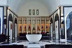 L'inspiration romane se retrouve aussi dans le cloître adjacent au côté sud couvert avec des voûtes en croisée d'ogives. Au centre du cloître, une fontaine d'eau permet aussi de relier la construction à l'art islamique.