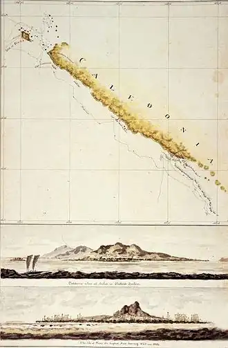 Le , l'enseigne de vaisseau James Colnett aperçoit à l'horizon une terre inconnue des Européens. Il se trouve à bord du bâtiment commandé par le navigateur et explorateur anglais James Cook, le HMS Resolution, durant son deuxième voyage. Cook baptise cette terre New Caledonia en l'honneur de l'Écosse. En effet, l'aspect des côtes lui aurait rappelé cette région de Grande-Bretagne, dont le père de Cook est originaire (Caledonia est l'ancien nom latin de la province correspondant à l'Écosse britannique). Le premier contact avec des Kanaks a lieu le lendemain, à Balade au nord-est de la Grande Terre, puis l'expédition britannique longe la côte Est et arrive jusqu'à l'île des Pins le [9].