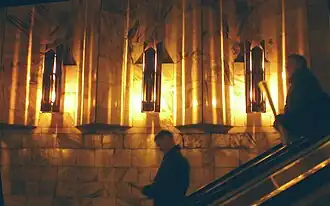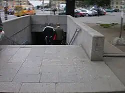 La station dispose d'hall souterrain avec douze bouches situées tout autour de la place située au-dessus. Le hall est en relation avec le quai par un tunnel en pente équipé de trois escaliers mécaniques[2].