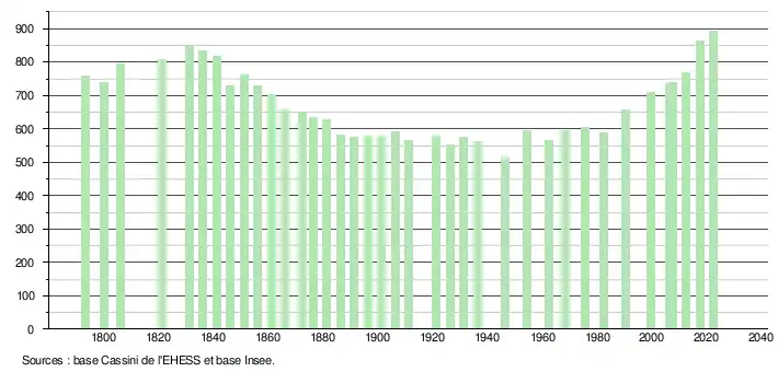 L'évolution du nombre d'habitants est connue à travers les recensements de la population effectués dans la commune depuis 1793. Pour les communes de moins de 10 000 habitants, une enquête de recensement portant sur toute la population est réalisée tous les cinq ans, les populations de référence des années intermédiaires étant quant à elles estimées par interpolation ou extrapolation[31]. Pour la commune, le premier recensement exhaustif entrant dans le cadre du nouveau dispositif a été réalisé en 2007[32].