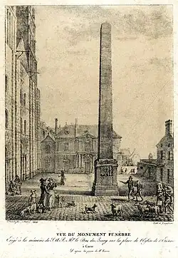 Le , le duc meurt de ses blessures après un attentat perpétré la veille par un bonapartiste à la sortie de l'opéra. Dès le 6 mars 1820, le conseil municipal de Caen décide de faire construire un monument en sa mémoire[B 1]. Le roi Charles X ne souhaite pas de statue représentant le défunt, mais plutôt un hommage funèbre inspiré par la piété[B 1]. C'est donc un cénotaphe en forme d'obélisque qui doit être élevé sur le parvis de l'église Saint-Étienne sur le lieu même où le dauphin a mis pied à terre[B 1] le [2],[note 1]. Le monument est dessiné par Jean-Baptiste Philippe Harou[A 1] ou plus probablement par son fils Romain Harou[3],[4]. Le , le monument est autorisé par ordonnance royale[B 1],[note 2]. Il est financé par voie de souscription[A 2]. La première pierre est posée le , date d'anniversaire de l'attentat contre le duc de Berry[B 1]. Pour l'occasion, Joseph Langlumé produit une lithographie représentant l'état fini du monument. En , la réalisation des deux bas-reliefs en bronze est confiée à Louis Petitot[B 1],[note 3]. Ils sont posés sur les côtés du monument en 1829[B 2].