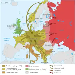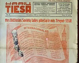 Le 15 juin, l'URSS envahit la Lituanie[19]. Les troupes soviétiques attaquent les gardes-frontières lettons à Masļenki[20]. Le 16 juin 1940, l'URSS envahit l'Estonie et la Lettonie[19]. Selon un article du magazine Time publié au moment des invasions, en quelques jours, environ 500 000 soldats de l'Armée rouge soviétique occupent les trois États baltes, une semaine seulement avant la chute de la France face à l'Allemagne nazie[21].