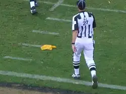 Pour les fautes où le point n'est pas important, telles que les fautes qui se produisent au snap ou pendant un ballon mort, le drapeau est généralement lancé verticalement.