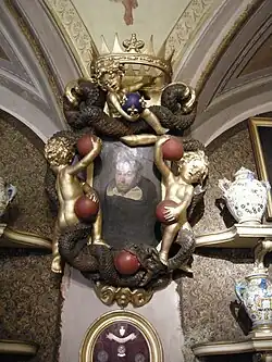La salle est embellie par la riche décoration en stuc du plafond voûté du XVIIIe siècle, avec des animaux fantastiques, des sphinx, des dragons, des aigles royaux, des masques, des guirlandes de fruits et des roses, autant de motifs chers au répertoire de l'époque. Certains éléments, les rubans et les festons, reviennent dans la sculpture en bois qui surmonte les armoires du XVIIe siècle. Dans l'armoire située dans le mur d'entrée, au centre de la sculpture se trouve une guirlande de roses en bois doré, surmontée d'une couronne, à l'intérieur de laquelle est représenté le Mariage mystique de sainte Catherine d'Alexandrie.