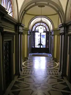 Deux exèdres s'ouvrent latéralement dans l'atrium classique, chacune avec une statue de marbre : Hygie et Galien, respectivement personnification de la déesse de la Santé et du dieu de la Médecine. Le petit vestibule est de style néogothique, avec des décorations principalement bleues et dorées, et donne accès à la salle de vente principale.
