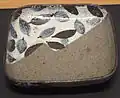 - Plat quadrangulaire (kakuzara) à décor d'iris. Entre 1699 et 1711. Grès, engobe blanche, émaux sous couverte. H 25,3 x L 22,8 x P env. 5 cm[6]