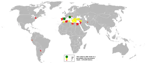 Les quatre premiers pays producteurs (Espagne, Italie, Grèce et Turquie) représentent 80 % de la production mondiale d'olives et les dix premiers, tous situés dans la zone méditerranéenne, 95 %. (Source FAOet le conseil oléicole international)