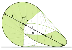 On considère maintenant l'enveloppe convexe de ces deux cercles (traits verts). On remarque alors qu'une portion de chaque cercle se trouve à l'intérieur de l'enveloppe convexe. Cela montre que l'on aurait pu aussi définir l'oloïde comme l'enveloppe convexe d'arcs de cercle d'angle 240° chacun (dessinés sur la figure en noir).