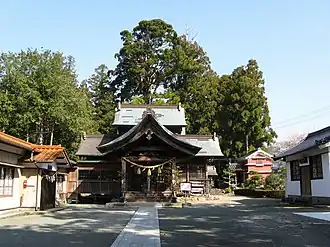 Le sanctuaire est fondé en 587 mais l'actuel bâtiment principal (shaden) date de 1705. Le 牡丹杉 (botansugi) cèdre japonais derrière le bâtiment principal est considéré comme sacré et passe pour avoir plus de mille ans. Il est désigné « monument naturel » (村指定天然記念物) par le village. Selon la légende, le sommet de l'arbre scintillerait en situations d'urgence. Pour cette raison, l'arbre est aussi appelé cèdre de la flamme éternelle (ou lumière votive) (燈明杉, tōmyō-sugi)[1].