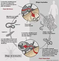 Le cycle évolutif est à deux hôtes : l'humain, hôte définitif, et un insecte, la simulie, hôte intermédiaire et vecteur.