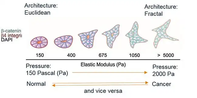 La fractalité est un moyen qu’a trouvé l’évolution pour minimiser l’énergie employée à distribuer des ressources. Rappelons que le cancer utilise une source d’énergie différente des autres tissus, moins efficace en rendement[50],[51],[52],[53],[54].