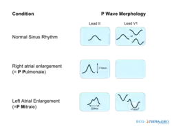 Les ondes P maximales (> 0,25 mV) suggèrent une hypertrophie auriculaire droite, cœur pulmonaire (rythme P pulmonaire)[1], mais ont une faible valeur prédictive (~ 20 %)[2].