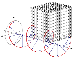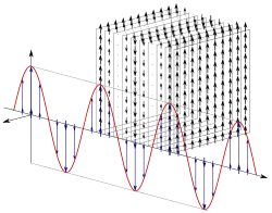 La première illustration vers la droite, est une représentation d'une onde électromagnétique polarisée linéairement. Étant donné que c'est une onde plane, chaque vecteur bleu, qui indique le déplacement perpendiculaire d'un point sur l'axe hors de l'onde sinusoïdale, représente l'amplitude et la direction du champ électrique pour un plan entier qui est perpendiculaire à l'axe.