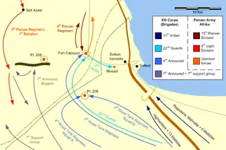 Dans l'étape initiale, les troupes britanniques devaient avancer sur trois axes afin de nettoyer la zone frontière. Au centre et le long de la côte se trouvaient les groupes, Coast Force et Escarpment Force. Le premier était chargé de la capture de la passe d'Halfaya[15], tandis que le second devait capturer le reste de la frontière, c'est-à-dire Fort Capuzzo, Musaid and Sollum. La 7e brigade blindée, avec l'artillerie de son groupe de soutien, avait la tâche d'engager et de détruire les blindés de Rommel, censés se trouver à Hafid Ridge[16]. Dans le même mouvement il devait encercler toute unité de l'axe située entre lui-même et le reste des troupes britanniques[17].