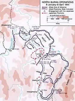 Pendant que l’offensive japonaise sur le front central est menée, les forces de Stillwell continuent à faire des gains. Le , deux divisions chinoises encerclent Kamaing. Deux jours plus tôt, les forces de Merrill avaient capturé le terrain d’aviation à Myitkyina après une marche qui traversa les montagnes Kumon Bum, cette marche a grandement affaibli les Marauders[4]. La capture de la ville est difficile, les premiers renforts sont des renforts de support et de logistique, on y attend des troupes aéroportées chinoises, qui n’arrivent pas avant que les Japonais reçoivent les leurs. On perd donc l’opportunité de capturer la ville facilement.