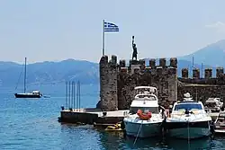 Poursuivant les navires ennemis, les Grecs franchirent les petites Dardanelles le , sous le feu des forts de Rion et Antirion[9], et entreprirent le blocus de Lépante, assiégée par terre par des troupes rouméliotes. La présence de la flotte entraina les villes de Missolonghi et Anatoliko à la révolte les 6 et , suivies de l'ensemble de l'Étolie-Acarnanie. Le , une attaque par un brûlot dirigé par un certain « Georges le Paxiote » échoua, ce dernier étant capturé, empalé et grillé sur un feu[10]. Les Grecs débarquèrent ensuite des canons pour établir une batterie, mais celle-ci fut prise par les Turcs lors d'une sortie de la garnison. Finalement, les Grecs à court de vivres et ayant atteint la période d'un mois pour laquelle les équipages avaient été payés, les deux escadres quittèrent le golfe de Corinthe les 26 et pour rejoindre leurs bases, permettant aux Ottomans de reprendre leurs communications maritimes et de ravitailler Patras[9],[11]. Selon Orlándos, seul serait resté le navire Agamemnon appartenant à Bouboulina, commandé par ses demi-frères et un de ses fils, accompagné des navires galaxidiotes et du navire de Céphalonie ; cette flottille se retira à Galaxidi lorsque l'escadre ottomane de Mourtos (en Épire) pénétra à son tour dans le golfe de Corinthe le , permettant aux navires bloqués à Lépante d'aller se ravitailler à Zante sous la protection de navires anglais[N 5],[12].