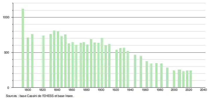 L'évolution du nombre d'habitants est connue à travers les recensements de la population effectués dans la commune depuis 1793. Pour les communes de moins de 10 000 habitants, une enquête de recensement portant sur toute la population est réalisée tous les cinq ans, les populations de référence des années intermédiaires étant quant à elles estimées par interpolation ou extrapolation[24]. Pour la commune, le premier recensement exhaustif entrant dans le cadre du nouveau dispositif a été réalisé en 2007[25].