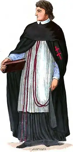 Le premier habit des chanoines est blanc, mais, à la perte de tous leurs établissements d’Orient, ils prennent en signe de deuil, l’habit noir qu'ils ont conservé par la suite[26].