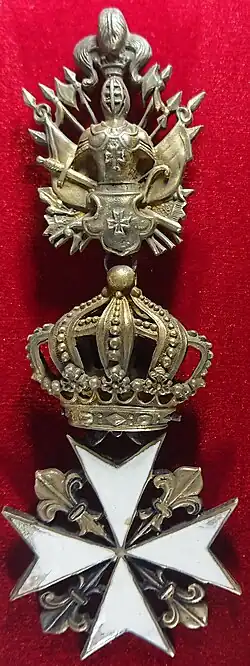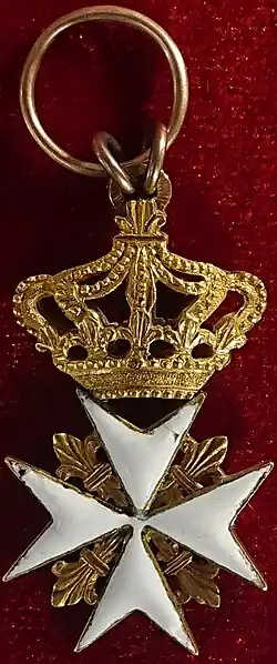 La décoration honorifique est une croix de Malte en or rehaussée d’émail blanche surmontée d’une couronne en or[réf. souhaitée]. Elle se porte sur la poitrine gauche, accrochée au ruban de l’ordre.