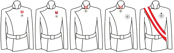 Le ruban est tiercé d'une bande blanche entre deux bandes rouges. Les grands officiers et les grands-croix portent une plaque sur leur habit. Aucune médaille d'ordonnance n'est surmontée d'une couronne royale. Une rosette apposée sur le ruban permet de différencier la médaille de chevalier de celle d'officier.