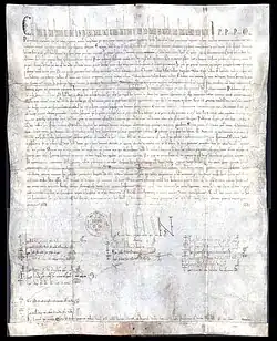 Bulle du pape Célestin III reconnaissant la fondation de l'abbaye de Strzelno en 1193 et lui accordant des privilèges.
