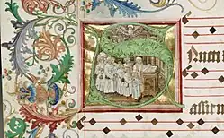 Sous Jean VII, abbé général entre 1391 et 1409, l'usage de la mitre et de la crosse pour les abbés de l'ordre se répand, ce qui est une entorses aux antiques traditions de simplicité et d'humilité[33]. L'apparition des ordres mendiants au XIIIesiècle, exempts de l'autorité épiscopale par le fait de privilèges obtenu directement du pape, suscite la jalousie des ordres monastiques et canoniaux plus anciens, qui cherchent à obtenir à leur tour la précieuse exemption. En 1409, les Prémontrés l'obtiennent en totalité du pape Alexandre V, qui exempte l'ordre de toute juridiction des patriarches, archevêques, évêques, et autres ordinaires. Le gouvernement de l'ordre en devient plus facile, mais cette mesure le prive du soutien matériel et moral des évêques qui répugnent à favoriser l'établissement de communautés dont le gouvernement leur échappe totalement[34].