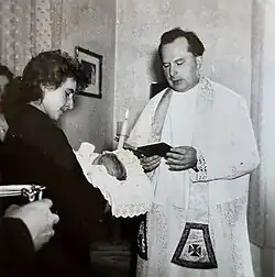Baptême clandestin célébré dans un appartement en Tchécoslovaquie par un chanoine prémontré en 1960.