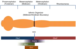 L'interaction entre Otx2 et Gbx2 au niveau du MHB entraîne l'expression du facteur de croissance des fibroblastes 8 (Fgf8). Parmi les isoformes connues de Fgf8, il a été démontré que Fgf8a et Fgf8b sont exprimés au niveau de l'organisateur isthmique, Fgf8b étant prévalent[1]. L' expression de Fgf8 conduit à l'activation de En1 dans les cellules qui expriment à la fois Irx1 et Otx2.