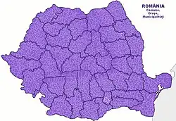 La Roumanie compte 208 villes (oraș) et 103 municipalités (municipiu). La différence entre les villes et les municipalités est que les dernières sont plus développées et plus urbanisées, et en général elles ont plus de 15 000 à 20 000 habitants. Il y a 2 825 communes, divisées en 13 092 villages. Les villages et hameaux n'ont pas d'administration individuelle, et ne sont donc pas des divisions politiques, mais seulement des cantons (ocoluri) administratifs des communes.