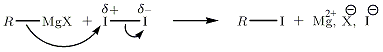 On propose la substitution nucléophile de RMgX sur I2 (la polarité de cette molécule est induite).