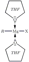 L'éther joue ici un rôle double, il solvate l'organomagnésien formé et le stabilise, l'organomagnésien est ici un acide de Lewis, le solvant joue ici le rôle de base de Lewis, ainsi les doublets non liants de l'oxygène vont permettre de stabiliser le centre réactif du magnésium. On peut par exemple utiliser l'éther diéthylique ou le tétrahydrofurane (THF), cf. figure ci-dessous.