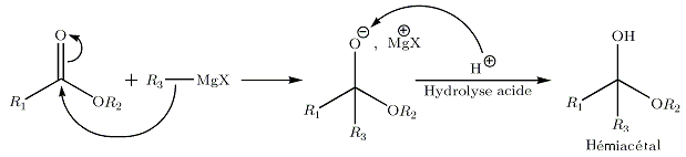 La réaction conduit à la formation d'une cétone isolable s'il n'y a pas trop d'organomagnésien. Cette cétone instable va réagir avec l'organomagnésien qui se trouve dans le milieu réactionnel selon la réaction suivante :